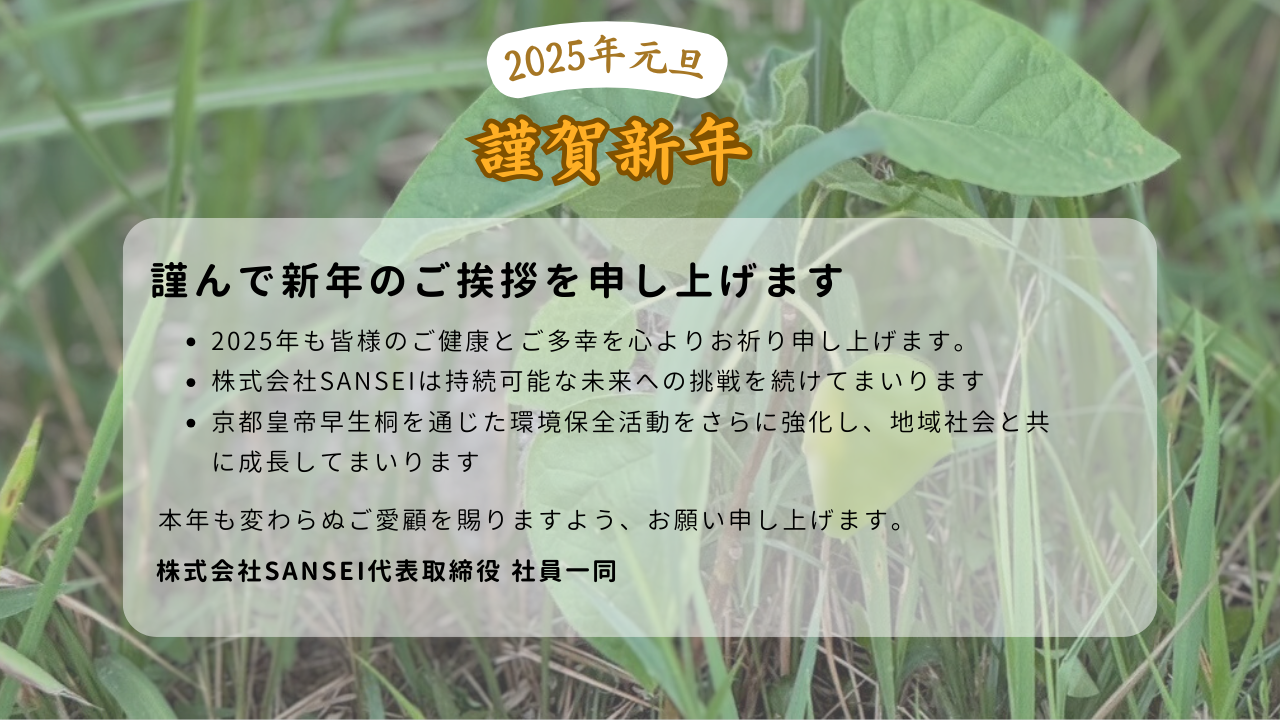 昨年も、多くの皆様のご支援とご愛顧を賜り、私たちは持続可能な未来に向けた取り組みをさらに深化させることができました。特に、京都皇帝早生桐を活用した環境保全事業は、大きな成果を挙げることができました。この活動は、SDGs(持続可能な開発目標)の推進に寄与し、カーボンニュートラル社会への実現に貢献するものです。